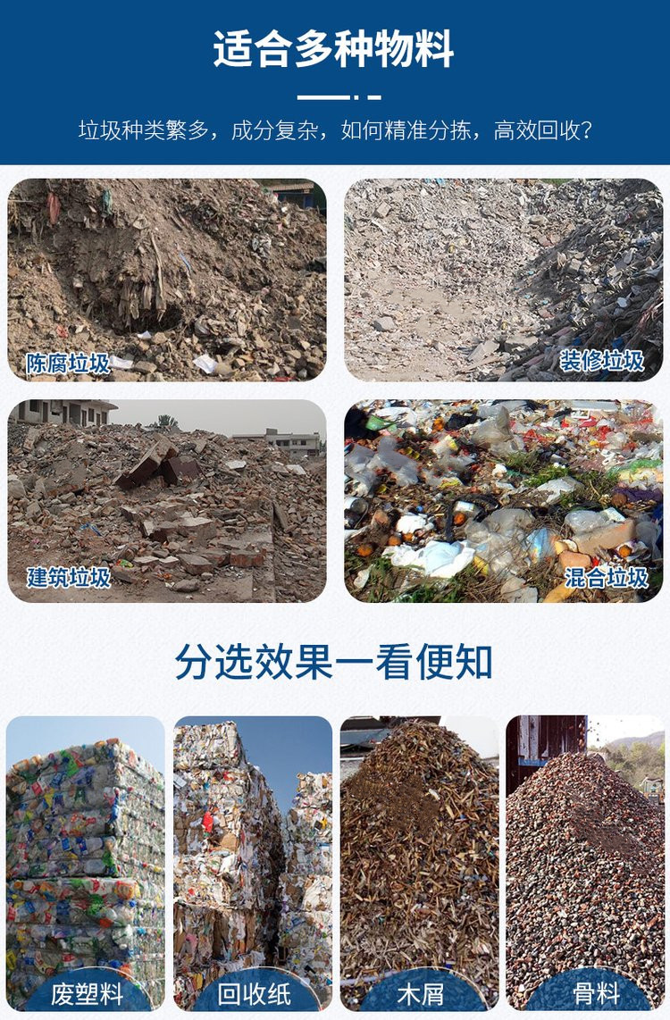 垃圾分揀設備是將混合垃圾自動分類的一種高科技設備。能夠對垃圾進行后續綜合處理和全部再利用,并實現垃圾零填埋目標。是我公司自主研發的先進設備,是混合垃圾分選及綜合利用的關鍵設備之一。其原理主要是根據混合垃圾中各種成份的不同粒度、不同比重,在設備中記過輸送、破袋、破碎、揚料、翻滾,使粘附在一起的各種成份垃圾充分分離,按不同性質分選出2-3種粒度,再通過磁選、篩選、風選、重力選等技術,把混合垃圾分選為建筑垃圾、有機垃圾(腐殖土)、可燃垃圾、塑料垃圾、金屬垃圾共五類物料,準確率達95%以上,資源回收率可達97%,日處理混合垃圾量可達到450噸~1000噸,相比國外的一些同類產品具有很高的性價比。分離后的物料科作為垃圾綜合利用的原料進而再次投放市場銷售。