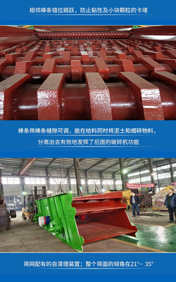 棒條式篩分機設備特點:由于各點的速度是周期性變化的,故考慮水平、垂直方向的速度值。沿篩面長度方向上,從進料端開始,物料運動速度為遞減狀態。篩箱上各點沿篩面的水平分速度變化完全相同,具有相同的幅值和相同的相位,這保證了物料顆粒的正常輸送;在垂直于篩面的分速度在進料端,逐漸遞減,可以保證在進料端物料有足夠的大的速度起跳,使進料端粒度分布的物料有足夠的能力向前運動,均勻分層,而篩體中部有較穩定的料流速度,物料透篩概率增大,從而提高了篩分效率。