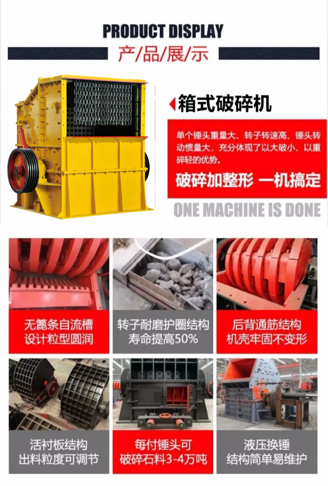單錘式破碎機 (Box-type breaker)也稱重錘破碎機,方箱破碎機,是吸收國內外先進技術,綜合普通重錘式破碎機、反擊式破碎機、立軸重錘式破碎機及各種用錘頭(板錘)對石料進行打擊破碎的機械原理上,經過優化設計后,制造生產出了最新一代破碎機械產品,改變了以篦條控制出料顆粒大 小的方法,減少了錘頭在破碎腔內的磨損,使錘頭的壽命提高4—6倍,每付錘頭可破碎石料3—4萬噸,實現了破碎技術的重大突破,真正達到了事半功倍的效果。