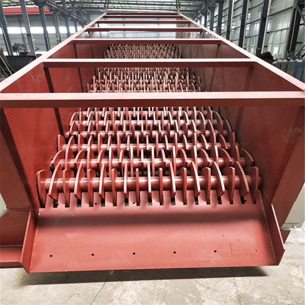 由電機(jī)驅(qū)動(dòng)帶有不規(guī)則的形狀裝置的連動(dòng)軸進(jìn)行翻動(dòng),篩面由很多根直線排布回轉(zhuǎn)軸承構(gòu)成,在滾軸上有相等的篩盤排布,滾軸通過齒輪帶動(dòng)輪鏈傳動(dòng)而旋轉(zhuǎn)的,其旋轉(zhuǎn)的的方向與原料流動(dòng)的方向一致,軸與軸之間有間隙,鑲嵌在軸上的不規(guī)則裝置托起大粒度物料向前運(yùn)動(dòng),因?yàn)楹Y軸是按各不相同的運(yùn)行方向設(shè)計(jì)的,所以當(dāng)材料在運(yùn)行方向高的地方運(yùn)行時(shí)的速度較快;當(dāng)材料在運(yùn)行方向較低的地方運(yùn)行時(shí)的速度較低緩。兩種各不相同的速度運(yùn)行下的材料,在篩面某一地方相匯時(shí)開始做軸向運(yùn)作,如此一來就使材料均衡性地分布在篩面上,提高篩分的工作效率,小顆粒物料則落入分離機(jī)底部由皮帶機(jī)送出。