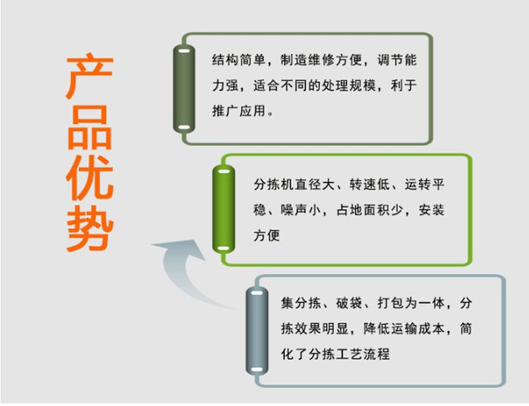 垃圾分揀機主要目的在于將垃圾中不同種類、不同尺寸和不同比重的組分,通過分選、篩分和破碎實現有效分離,從而達到熱值高的部分進行焚燒處理,含有機質的生化處理,可回收利用的進行回收利用,無法資源利用的再進行填埋處理。